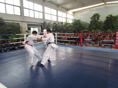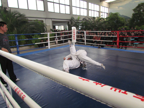 背摔、抱雙腿扛摔、抱單腿枕、抱腿功、掏腿、扣腿、揣絆功這些很專業的動作,在我們太極這群男子漢身上卻都是那樣運用自如。比賽期間太極公司散打隊員也上臺即興表演,更是有我們太極的“歌手”獻歌助興,掌聲、喝彩聲、吶喊聲、歡笑聲……此時此刻每一個太極人都無比的歡樂和驕傲。