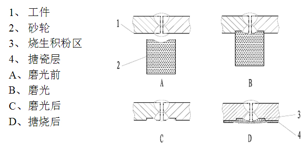 很多小的搪玻璃反應釜生產廠家或小作坊在設備生產制造過程中,由于生產工藝的不成熟,較容易出現燒成不夠(俗稱燒生)或焊縫內氣體沖破搪瓷(俗稱電焊泡)兩大缺陷。一般采用埋弧焊的內縫的焊縫余高可達2-3mm,這樣,在磨光工序時會將砂輪表面形成弧槽,當加工下一工件時,會將焊縫兩側磨洼下去,再經噴粉、搪燒,積粉區因溫度積累不夠,而形成“燒生”現象,這類產品從表面是無法肉眼判斷出來的,用戶將該產品投入使用后,在交變載荷作用下,積粉區表面搪瓷由于脆性極高,且缺乏鋼板支持,較易碎裂,也就是俗語的“爆瓷”現象。而且存在的未經燒成的“生粉”是沒有任何防腐能力的,以致物料直接滲透過積粉區,腐蝕鋼板基體,破壞容器。為了我們方便大家理解,請結合下圖就行分析。