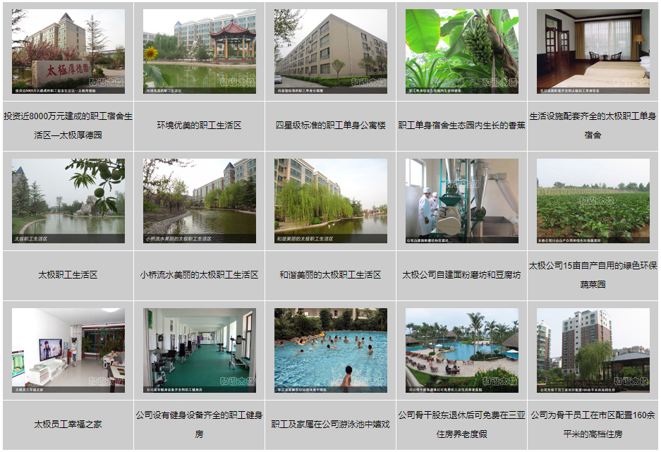 在2008年,太極公司投資近8000萬元建成了職工公寓樓3座,戶外綠樹溪湖環繞,每戶面積170平米,統一配置60寸夏普電視等。所建成的職工單身公寓樓采用四星級標準,共176間房,人均戶面積50平米,統一配置電視、網絡、洗浴間、床柜、空調、暖氣、桌椅等。而且單身公寓內設有3000余平方米的生態園林和高檔游泳池,一年四季綠樹茂盛常春。
